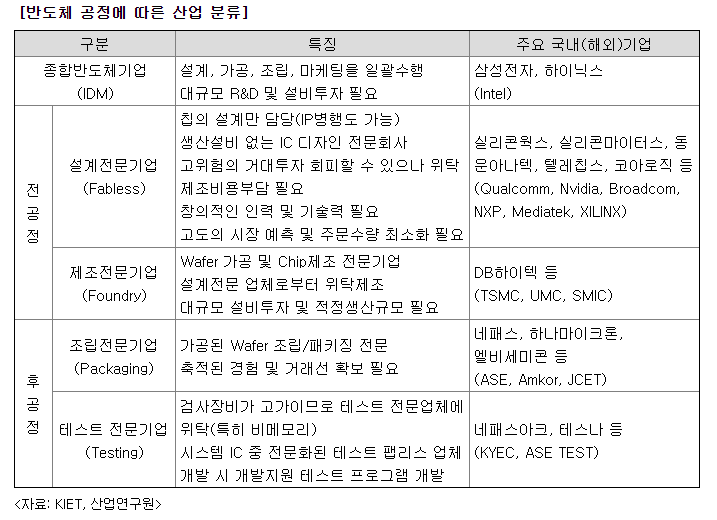 삼성전자와 하이닉스 처럼 종합 반도체 기업이 있는 반면에 전, 후공정을 전문으로 하는 업체도 있습니다. 그중 네패스는 후공정 중 조립 전문기업이며, 네패스 아크는 테스트 전문으로 하는 기업입니다. 그중 비메모리를 담당하여 진행하고 있습니다. 비메모리는 삼성전자가 주력으로 하고 있습니다.