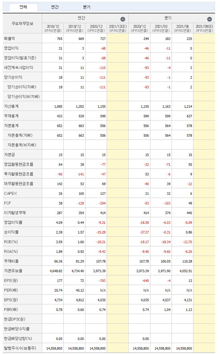 - 영업이익은 20년 부터 적자를 기록 하고 있으며 21년도 1분기에도 적자였습니다. 당기순이익도 적자입니다.