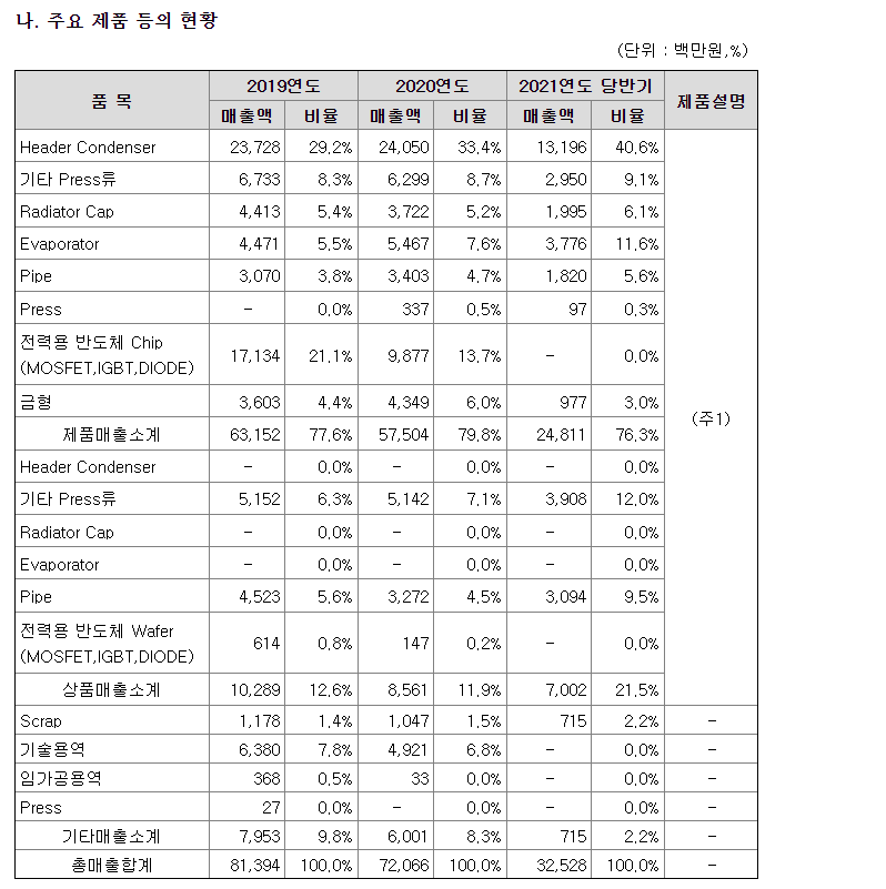 당사는 공조관련부품 이외에도 기타 Press류의 제품을 생산 판매하고 있습니다. 기타 Press류의 품목들은 기능별 품목별로 모두 상이한 부품들로 이루어져 있습니다. 당사가 매출하고 있는 기타 Press류의 주요 제품들에는 Crank Arm(와이퍼), Dust Shield, Seat Motor Bracket, WTOC Bracket, 기타 Clip 류 등이 있습니다.