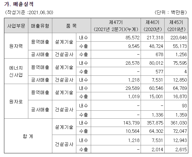 - 발전소 및 플랜트 관련 엔지니어링 업체로서 원자력발전소의 설계, 수화력발전소의 설계, 발전설비 O/M, 플랜트 건설사업 및 PM/CM 사업 등을 영위하고 있음.