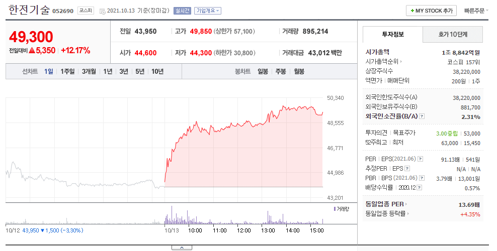 2. 한전기술 주가 및 차트