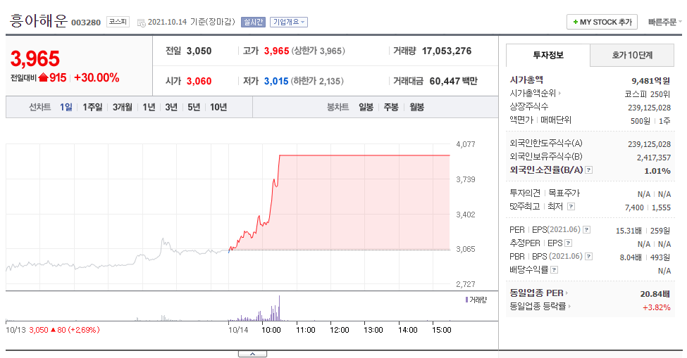 흥아해운, 미국 물류대란 해소 기대감에 상한가 : 네이버 금융