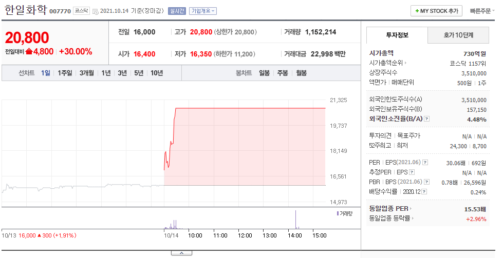 [특징주] 한일화학, 아연 가격 최고치 경신에 상한가 : 네이버 금융