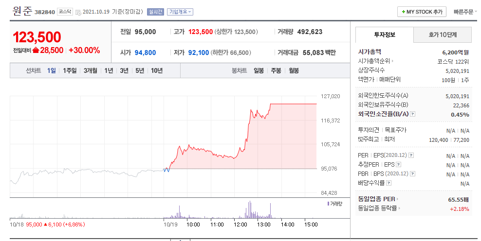 [이데일리 김겨레 기자] 지난 7일 코스닥 시장에 상장한 원준이 19일 처음으로 상한가를 기록했다. 19일 마켓포인트에 따르면 오후 3시26분 기준 원준(382840)은 전날보다 2만8500원(30%) 오른 12만3500원