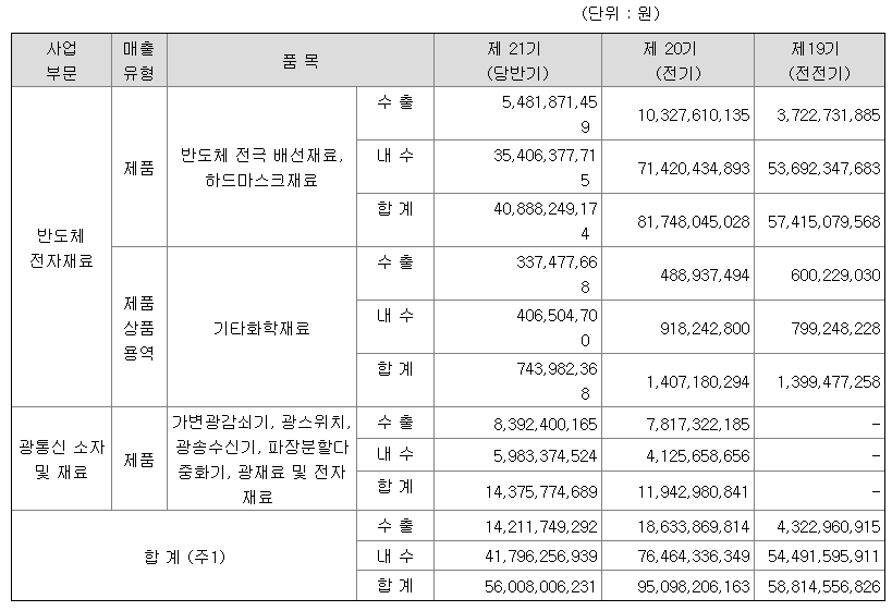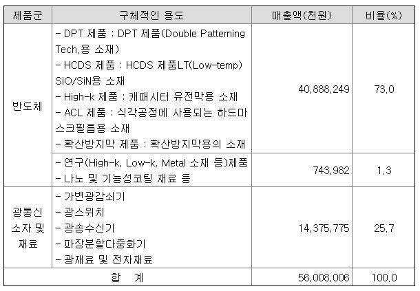 6. 기타 제품: 고객사 및 장비회사와 진행하는 연구개발이나 양산 평가 목적의 차세대 반도체 재료 샘플 매출과 터치패널과 필름, 자동차 등에 사용되는 기능성 코팅제와 나노소재 매출이 포함되어 있습니다