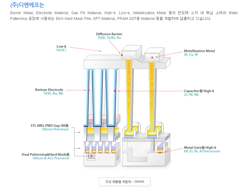 디엔에프(이하 동사)는 2001년 1월 설립된 반도체 소자 형성용 박막재료 개발 및 제조 전문기업으로, 반도체 박막재료 분야의 토털 설루션을 제공할 수 있도록 반도체 박막재료 트렌드 분석, 연구개발, 상용화 테스트, 생산, 납품 등을 수행하고 있다. 동사는 국내외 고객사 확보를 위해 주요 반도체 칩 메이커를 대상으로 지속적인 판매처 구축을 추진 중이며, 지속적인 연구개발을 통해 신규 제품 라인업을 확보하는 등 사업 규모를 확대하고 있습니다.
