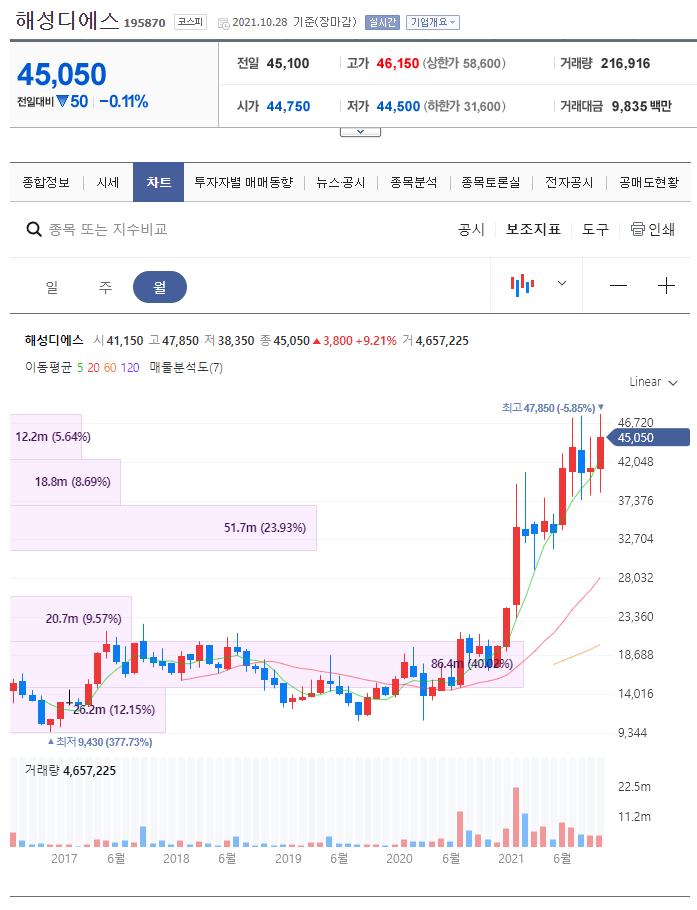해성 디에스 월봉차트입니다. 21년도부터 급격한 상승을 보이고 있네요. 반도체 소재 관련주들이 급등하는 모습을 보이고 있습니다.