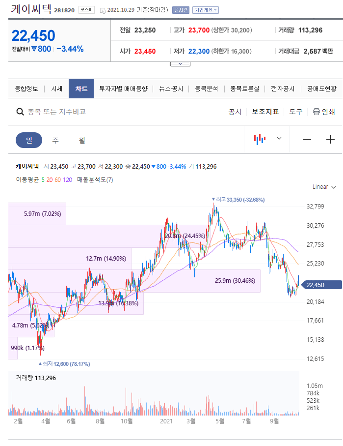 반도체 장비 관련주 케이씨텍 주가 전망 및 재무제표 분석 중 일봉 차트입니다.