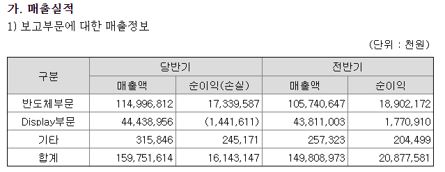 - 반도체 부분의 매출액이 디스플레이어보다 더 높으며, 작년 반기보다 매출액이 더 높으나 순이익은 더 낮습니다. 디스플레이어 쪽 적자가 원인으로 보입니다.