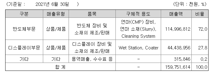 당사는 반도체 및 디스플레이 공정에 사용되는 전공정 장비 및 소모성 재료의 제조 및 판매를 주력사업으로 영위하는 기업으로서 반도체 CMP/세정 장비, 디스플레이 Wet-station/Coater 장비, 반도체 Slurry 및 디스플레이 소재 등의 Line-up을 갖추고 있습니다.