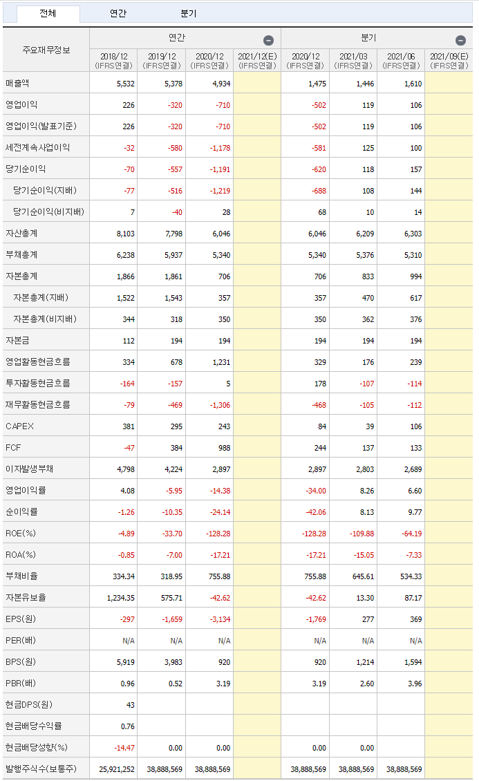 - 19년도부터 적자인 회사입니다. 영업이익과 당기순이익이 2년 연속 적자입니다. 하지만 21년도 1분기부터는 흑자로 보이네요.