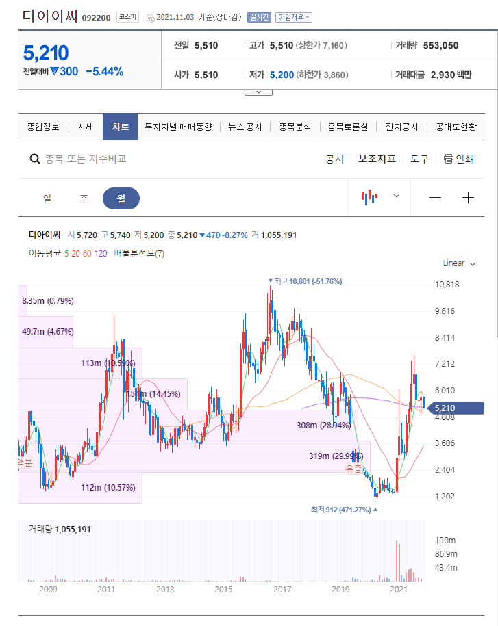 테슬라 관련주 디아이씨 주가 전망 및 재무제표 분석 중 월봉차트입니다. 19년도에 유상증자를 했던 내역이 있습니다.