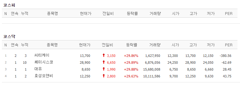 코스닥 : 씨티케이, 세미시스코, 대유, 효성오앤비
