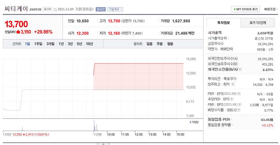씨티케이 (썩는 프라스틱 개발 소식에 상한가)