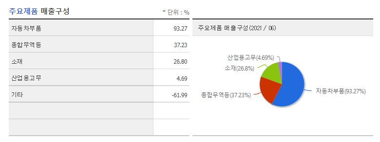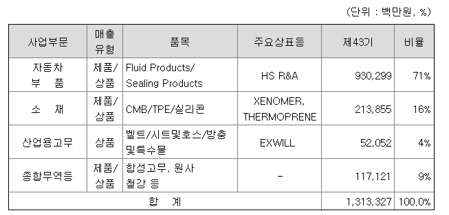 - 자동차 부품 부문은 자동차용 고무제품을 생산/판매하고 있으며, 주 제품은 Sealing Products 등임. 지배기업은 품질경영 강화를 통해 현대기아차로부터 품질 5 스타를 획득.