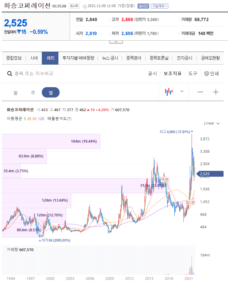 - 월봉 차트이며 오래된 회사입니다. 액분을 하였던 회사입니다.