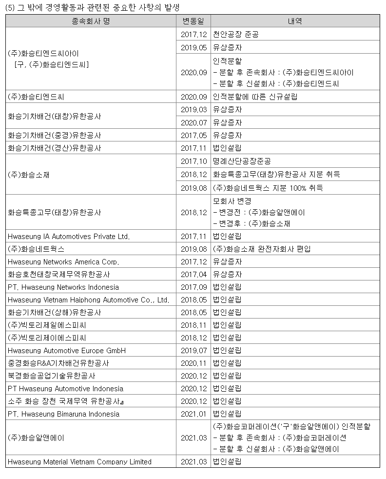 - 화승그룹은 법인 설립 및 유상증자 내역이 많이 있습니다.