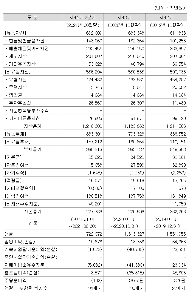- 반기보고서 재무제표입니다. 매년 부채는 많아지고 매출액은 줄고 있으나 연결 회사는 많이 지고 있습니다.