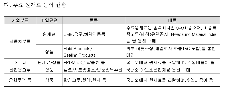 주요원재료인 EPDM, 카본 등은 국제유가, 환율 등의 요소로 변동성을 보이고 있습니다.