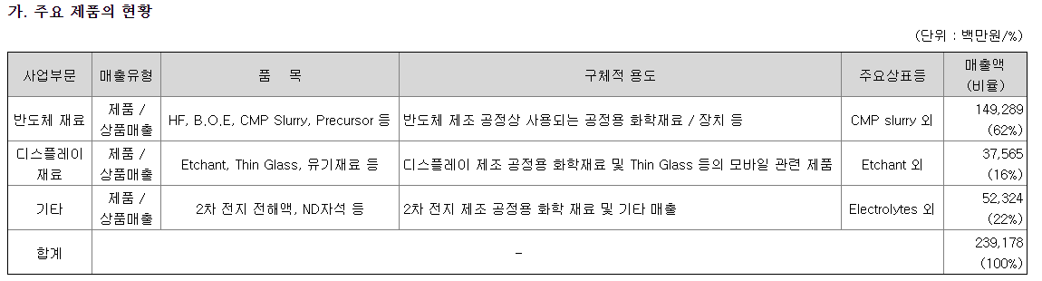 매출구성은 2020년 12월 기준 반도체 재료 67.66%, 기타 16.31%, 디스플레이 재료 16.03% 등으로 이루어짐.