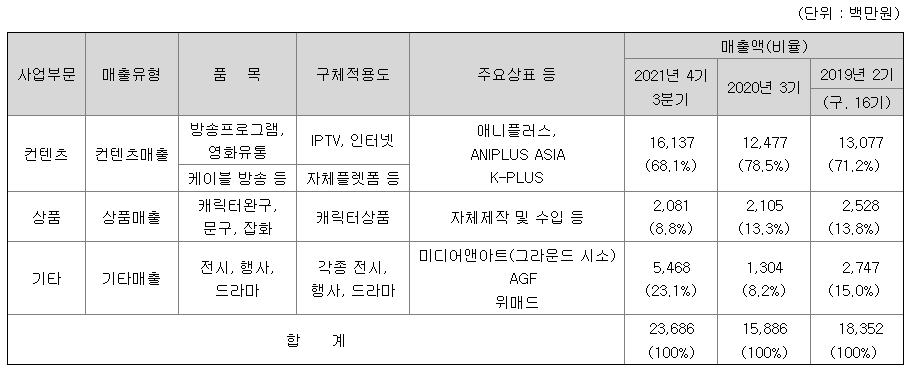 - 동사는 유스 애니메이션을 핵심 콘텐츠로 하는 'ANIPLUS' 방송사업을 주 사업으로 VOD 사업 사업, 극장판 애니메이션 배급사업, 전시 이벤트 사업, 드라마 제작 사업 등 관련 사업 영역으로 다각화를 전개함.