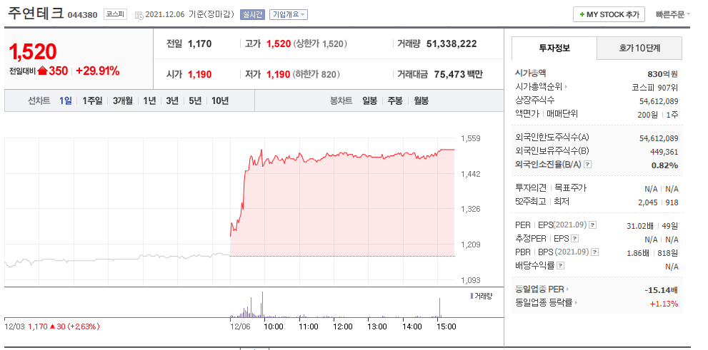 주연테크, NHN벅스, 서연탈메탈 오늘의 상한가 주식(2021.12.06.)