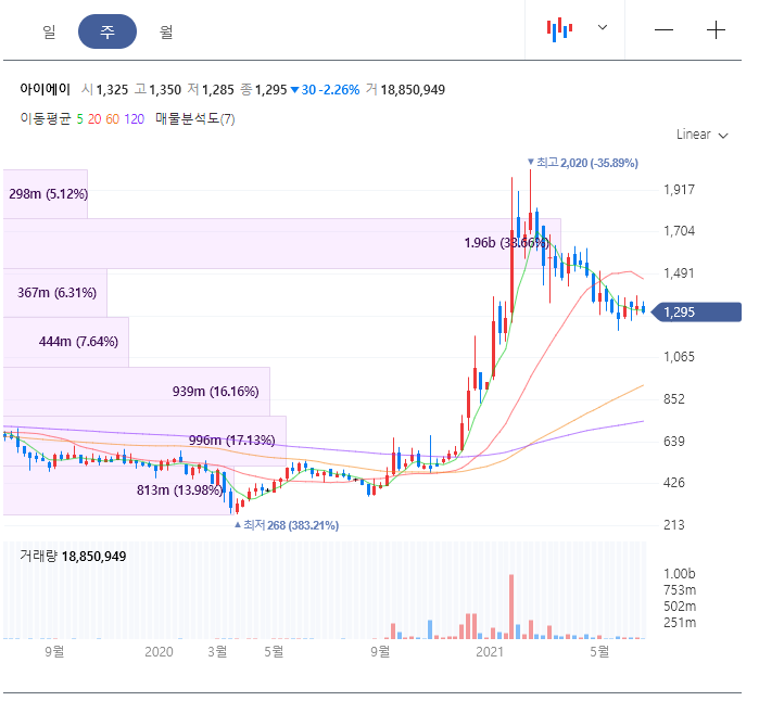 차량용 반도체 기업 아이에이 주가 전망 분석 중 차트 '주봉'입니다. 고점 대비 조금씩 내려가고 있습니다.