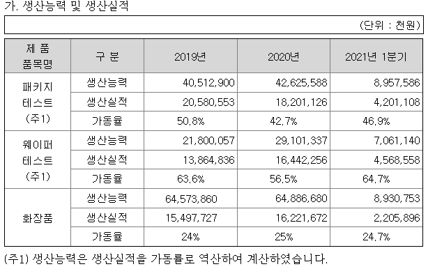 가족사와 매출이 같이 잡혀있습니다. 화장품,의약품에 비해 반도체 테스트가 매출액이 더 높습니다.