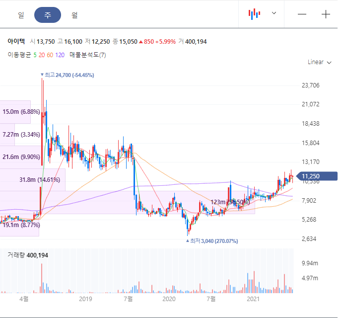 시스템 반도체 테스트 회사 아이텍 주가 전망 분석 중 주봉 차트입니다. 현재는 11,250원 입니다.