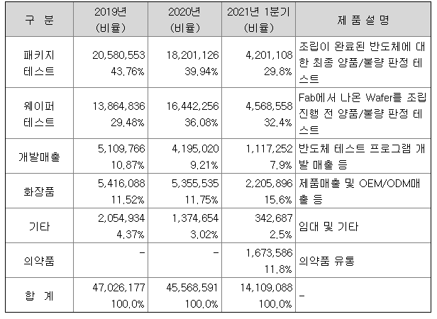 주요매출 비중은 패키지테스트 48.84%, 웨이퍼테스트 38.25%, 개발매출 9.54% 기타 3.37%로 구성됨.