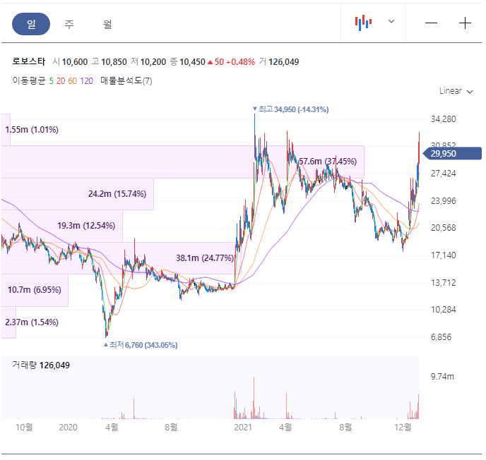 - 로봇 관련주 로보스타 주가 전망 및 재무제표 분석 중 일봉 차트입니다. 최근에 매우 급등 하였습니다.