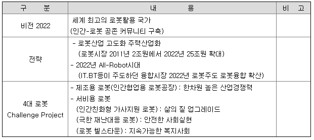 - 로봇제품 및 관련 부품ㆍ소재의 제조ㆍ유통, 로봇 S/W, 서비스 콘텐츠와 타 분야의 로봇화로 융합되는 산업을 포함하는 개념으로 고령화, 저출산ㆍ삶의 질 향상 등의 사회 문화적 트렌드에 따라 전세계적으로 그 중요성이 증대되고 있으며, 타 산업과 연계하여 상호 기대효과를 창출할 수 있는 유망한 산업이라 할 수 있습니다.