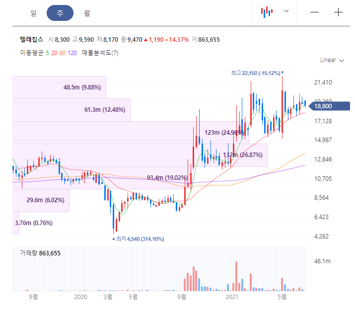 MCU 차량용 반도체 회사 텔레칩스 주가 전망 분석 중 시총은 2,539억원입니다. 52주 최고는 22,150원 이였습니다.