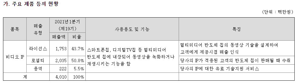 반도체 칩 제조사에 비디오 IP를 라이선스하고, 반도체 칩 회사는 동사의 비디오 기술 및 자체 기술을 활용하여 스마트폰이나 디지털TV 등에 들어가는 반도체 칩을 설계, 개발 및 제조하여 납품함.