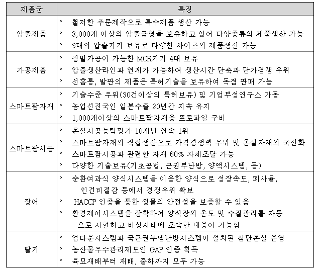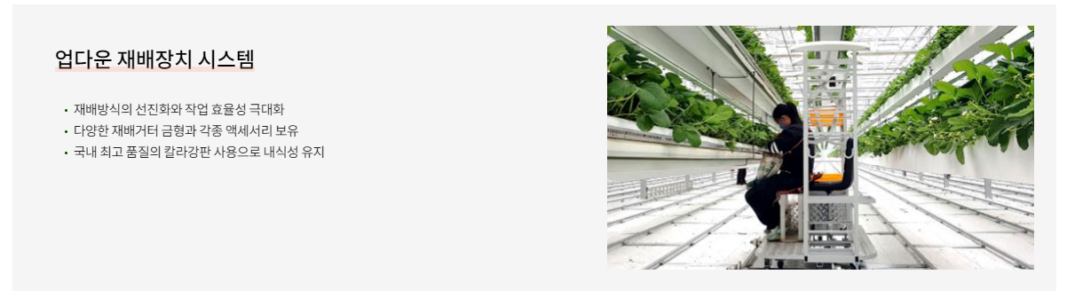 알루미늄 압출 생산라인을 기반으로 온실 기획, 설계, 자재 제작과 시공까지 전 공정이 가능하여 맞춤식 첨단온실의 "one-stop-service"를 구현하고 있음.