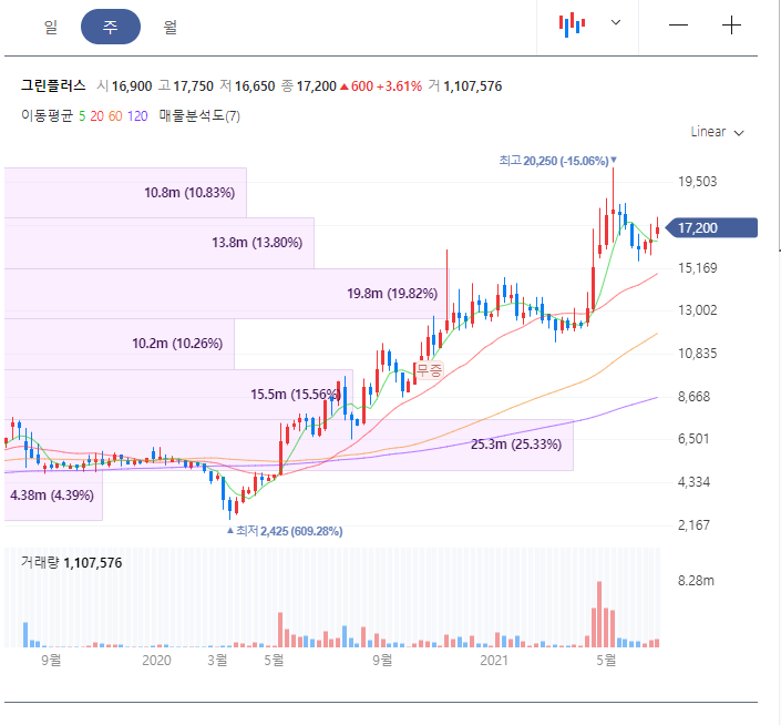 스마트팜 대장주 그린플러스 주가 전망 분석 중 주봉차트입니다. 무상증자 이후 급등하는 모습으로 보입니다. 코로나 이후 10배 정도 올랐습니다.