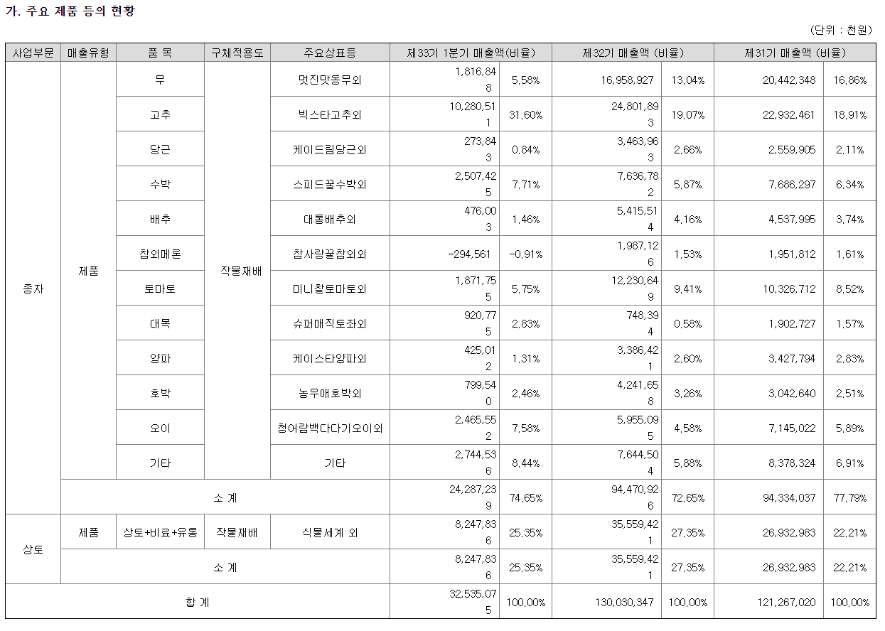 주요 매출원은 고추, 수박, 무, 배추 등 각종 종자매출이며, 원예 및 수도용 상토사업도 영위중.