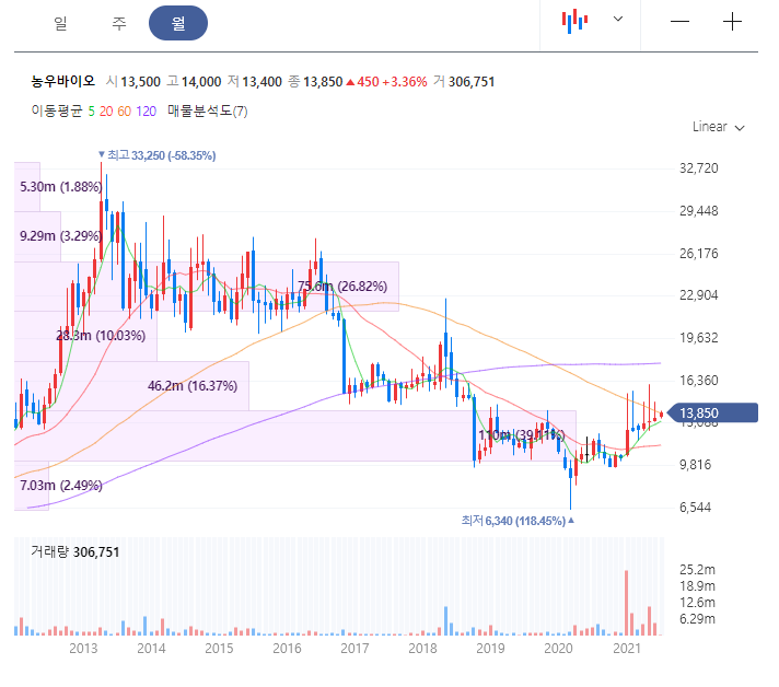 농업 관련주 농우바이오 주가 전망 분석 중 월봉 차트입니다.