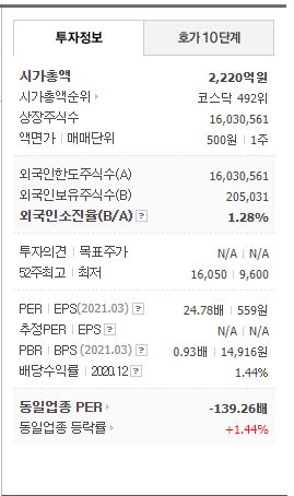농업 관련주 농우바이오 주가 전망 분석 중 시가총액은 2,220억원, 52주 최고가는 16,050원입니다.