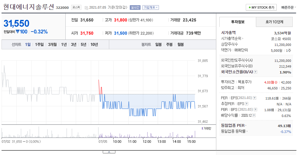 태양광 관련 회사 현대에너지솔루션 주가 전망 분석 중 시가총액은 3,534억원이며, 52주 최고가는 46,650원 이였습니다.