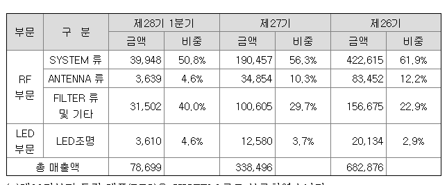 동사 및 종속회사는 무선통신 기지국에 장착되는 각종 장비 및 부품류 등을 생산, 판매하는 RF사업과 스포츠조명, 실외조명, 실내조명등을 생산, 판매하는 LED사업을 영위하고 있음.