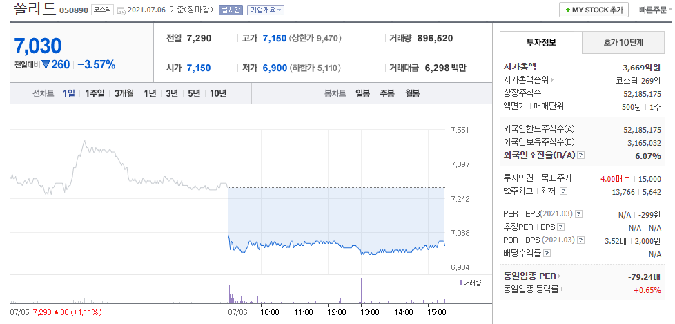 5g 관련주 쏠리드 주가 전망 분석 중 시가총액은 3,669억원 / 52주 최고가는 13,766원입니다.