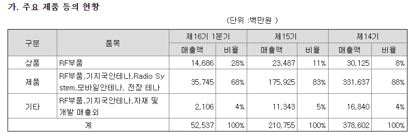 제품 중 RF, 기지국안테나, 라디오시스템, 모바일안테나, 전장 테나의 매출액이 상당부분 차지하고 있습니다.
