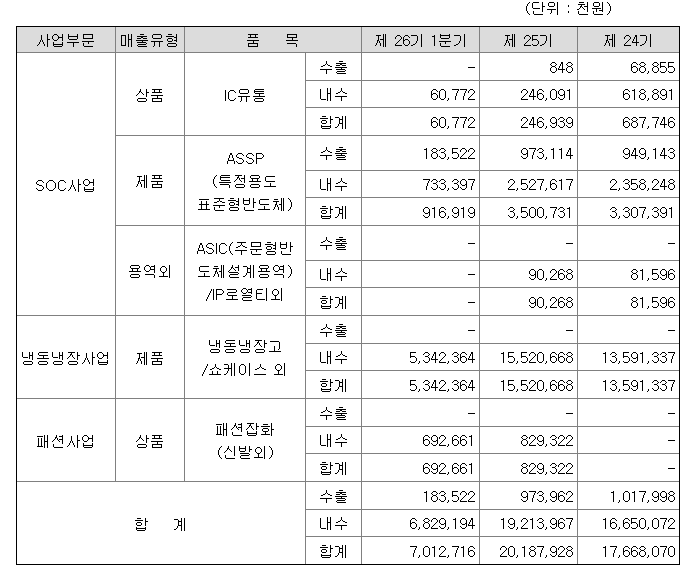 매출은 사업부문을 기준으로 SOC사업, 냉동냉장사업, 패션사업으로 구분됩니다. SOC사업부문 매출은 당사가 설계한 ASSP(특정용도 표준형 반도체) 판매, ASIC(주문형반도체설계용역)용역, MCU Core IP 라이센싱 등과 반도체유통(IC)으로 이루어지는 매출형태입니다. 냉동냉장사업부문의 매출은 회사가 직접 제조, OEM 및 쇼핑몰을 통한 판매하는 매출형태를 취하고 있으며, 패션사업의 매출은 국내외업체를 통하여 구입한 상품을 판매하는 방식의 매출 형태를 취하고 있으며 매출의 세부내역은 다음과 같습니다.