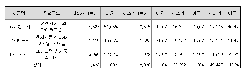 사업군별로 보면 소형 마이크로폰용 ECM 반도체, MEMS Microphone, 전자기기의 회로보호용 TVS 반도체를 주력제품으로 생산하는 소자급 반도체 부문과 자사 고유의 반도체 기술을 이용한 LED Moduleㆍ완제품을 생산하는 LED 조명 부문으로 구성되어 있고 신규사업으로는 6”FAB에서 생산하는 웨이퍼 파운드리 사업이 있습니다.