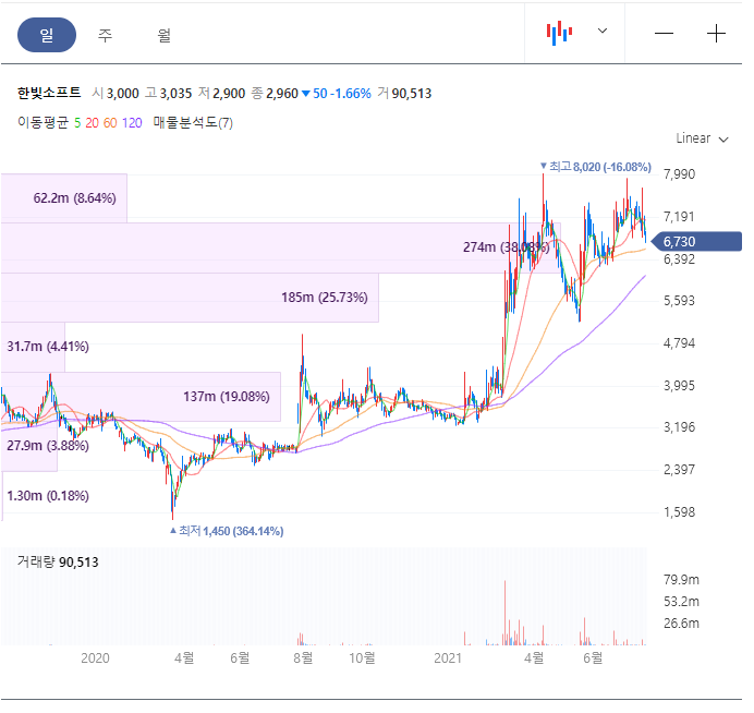 메타버스 관련주 한빛소프트 주가 전망 중 시가총액은 1,668억원이며 52주최고가는 8,020원입니다.