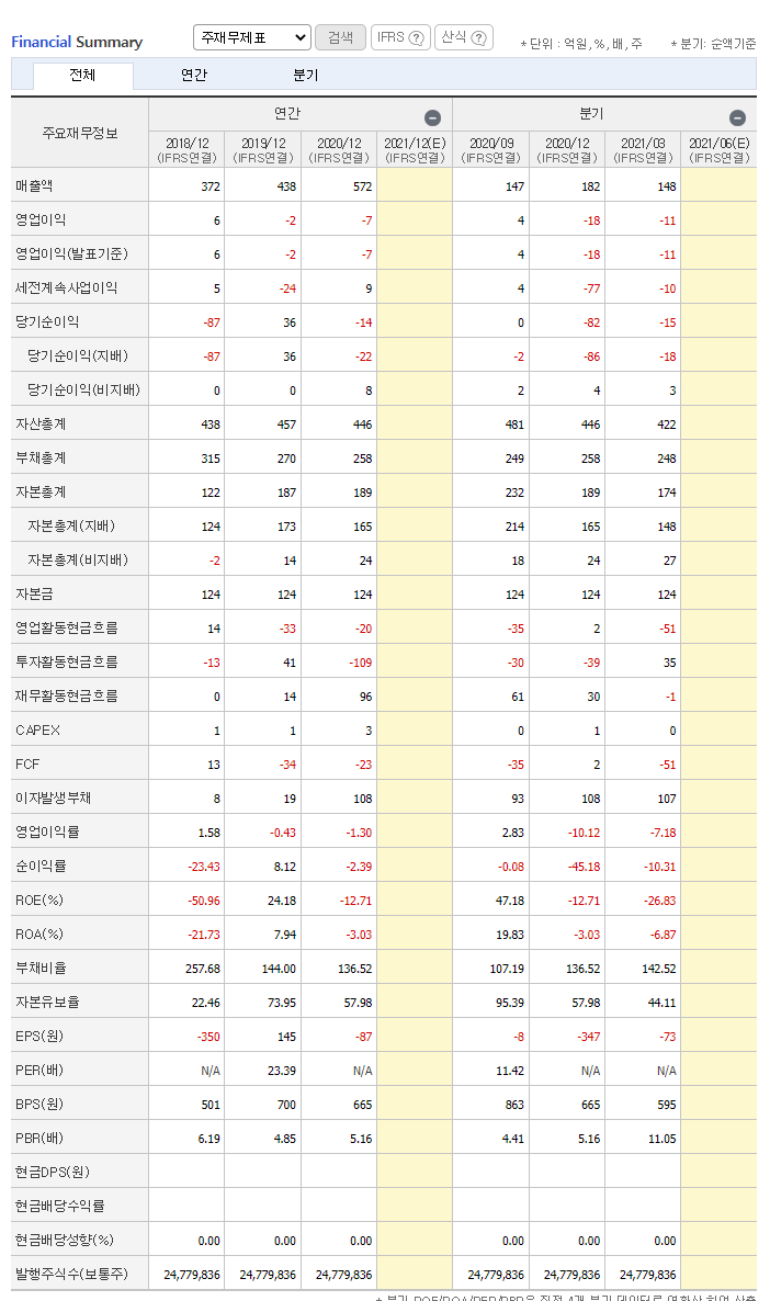 투자에 참고하시길 바라며, 상당히 투자하기 위험부담이 커보이는 회사입니다.