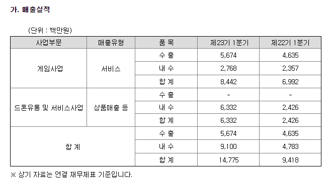 한빛드론을 연결대상 종속회사로 보유함. 매출은 게임 서비스 부문 57.14%, 드론유통 및 서비스 부문 42.86%로 구성됨.