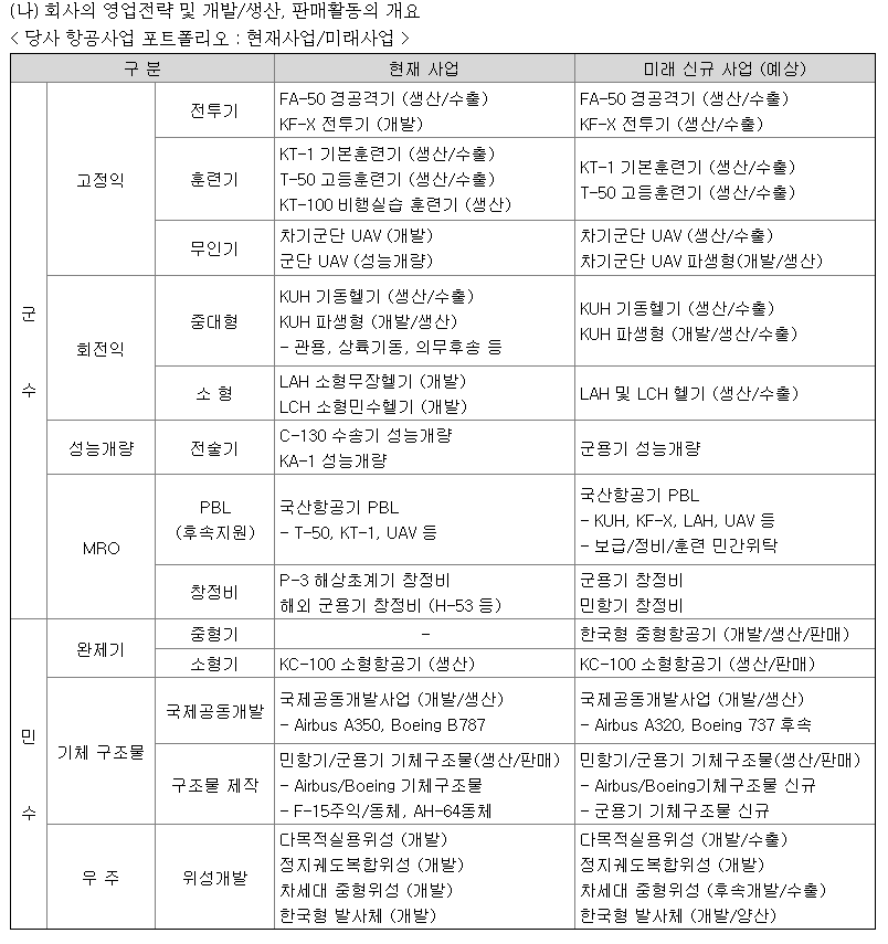 군수사업의 대부분은 내수로 구성되며 수요자인 한국정부(방위사업청)와 계약을 통해 제품(군용기)의 연구개발, 생산, 성능개량, 후속지원 등을 수행.